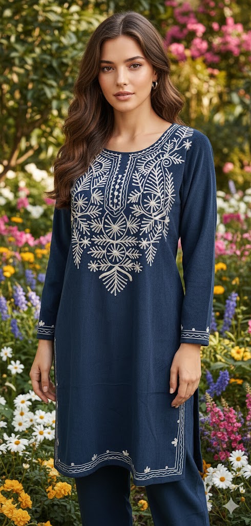 What makes this Arctic Indigo Woolen coord set truly special is its exceptional versatility. Wear it to festive gatherings, office events, casual outings, or winter dinners—the outfit seamlessly blends traditional charm with modern fashion. The embroidered details photograph beautifully, making it an excellent choice for winter photoshoots, celebrations, and social media styling. The indigo tone complements various skin tones, while the white embroidery adds the perfect contrast to enhance visual appeal.